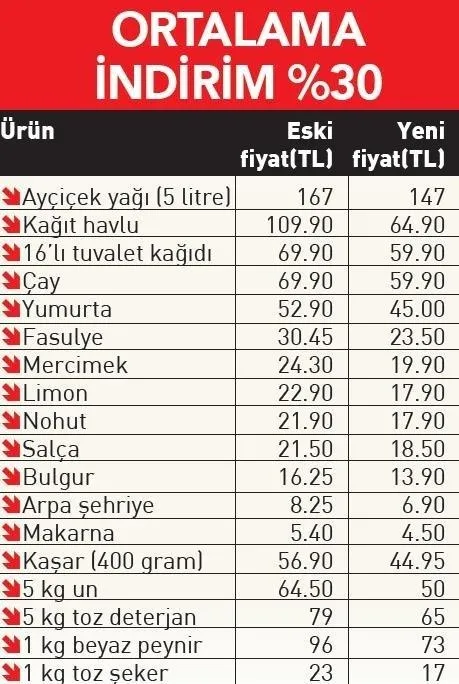 İndirim uygulanan ürünler arasında yer alan yarım yağlı sütün fiyatı 14.75 TL'ye düştü. 2 litre zeytinyağının fiyatı 117.90'a gerilerken, kuru soğanın fiyatı 7.95'ten 5.95'e indi. 1 kilogram fasulyenin fiyatı 30.45'ten 23.50'ye, 1 kilo çay ise 66.90'dan 59.90'a düştü. Temizlik ürünlerinde de ciddi indirim yapıldı. 5 kilo toz deterjan 78.90 yerine 64.90'a satıldı. Tarım Kredi Kooperatifi marketlerine yansıyan yüzde 30'a varan indirimli fiyatların ardından, zincir marketlerde de indirim uygulanması bekleniyor.