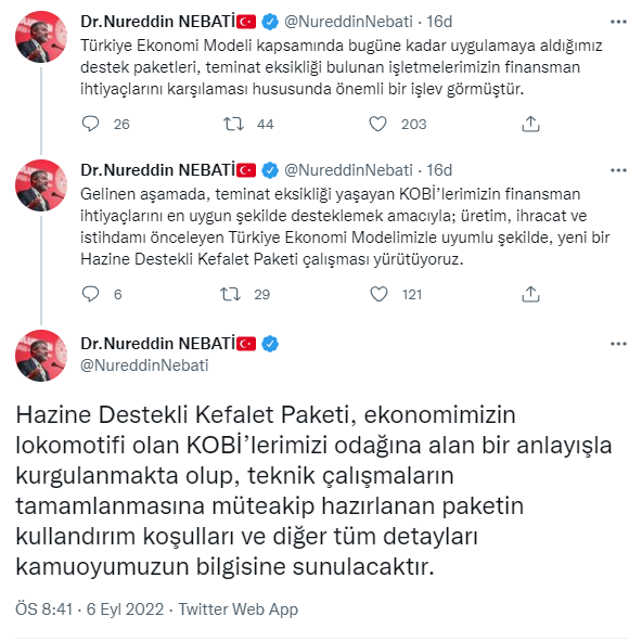 Gelinen aşamada, teminat eksikliği yaşayan KOBİ'lerimizin finansman ihtiyaçlarını en uygun şekilde desteklemek amacıyla; üretim, ihracat ve istihdamı önceleyen Türkiye Ekonomi Modelimizle uyumlu şekilde, yeni bir Hazine Destekli Kefalet Paketi çalışması yürütüyoruz.