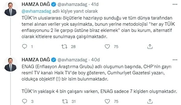 Dağ, ENAG'ın başında CHP'nin yayın organı Halk TV'de boy gösteren ve Cumhuriyet gazetesinde yazan Prof. Dr. Veysel Ulusoy'un olduğunu belirterek 7 çalışanla objektif olmayan verilerle yayın yaptığını belirtti ve "Tıpkı fonlanan masa başı anket firmaları gibi merdiven altı bilim yapan bu ciddiyetsiz oluşum hiçbir şeffaflık barındırmamakta, muhalefetin duymak istediği rakamları vermeyi bilim saymaktadır" ifadelerini kullandı.