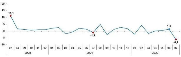 Mevsim ve takvim etkisinden arındırılmış sanayi üretimi temmuzda haziran ayına kıyasla yüzde 6,2 düşüş gösterdi.