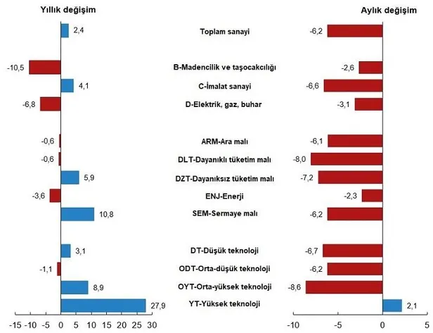 TÜİK verilerine göre, sanayi üretim endekslerinin takvim etkisinden arındırılmış yıllık değişim oranları şöyle: