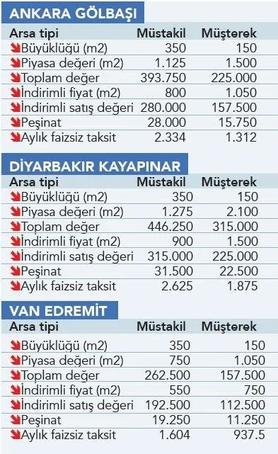 150 metrekarelik müşterek arsa ise 157 bin 500 TL'den satılacak. Aylık 1.312 TL taksitle vatandaşa sunulacak. Diyarbakır- Karapınar'da 350 metrekarelik müstakil bir arsa 315 bin TL, 2.625 TL taksitle vatandaşa satılacak. Van-Edremit'te de 350 metrekarelik müstakil konut yapımına uygun arsalar 192 bin 500 TL'den satışa sunuluyor. Bu arsalara 1.604 TL aylık taksitlerle sahip olunabilecek. 150 metrekarelik arsaları ise 937.5 TL aylık taksitlerle vatandaş alabilecek.