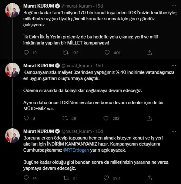 Çevre, Şehircilik ve İklim Değişikliği Bakanı Murat Kurum, TOKİ'den ev alan ve borcu devam edenlere bir müjdeleri olduğunu belirterek, "Borcunu erken ödeyip tapusunu hemen almak isteyen konut ve iş yeri alıcıları için indirim kampanyamız hazır. Kampanyanın detaylarını Cumhurbaşkanımız Sayın Recep Tayyip Erdoğan yarın açıklayacak." ifadesini kullandı.