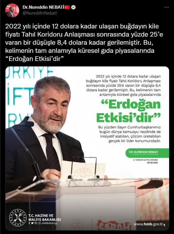 Hazine ve Maliye Bakanı Nureddin Nebati, Türkiye'nin, diplomasi alanında uygulanan politikalarla küresel gıda arz güvenliğinin sağlanmasında önemli bir aktör ülke konumuna geldiğini belirterek, "Nitekim Sayın Cumhurbaşkanımızın girişimleri ve liderliğiyle imzalanan Tahıl Koridoru Anlaşması, yeterli gıdaya erişim problemi yaşayan birçok ülkenin önemli ölçüde rahatlamasını sağladı. Bununla birlikte 2022 yılı içinde 12 dolara kadar ulaşan buğdayın kile fiyatı, Tahıl Koridoru Anlaşması sonrasında yüzde 25'e varan bir düşüşle 8,4 dolara kadar gerilemiştir. Bu, kelimenin tam anlamıyla küresel gıda piyasalarında Erdoğan etkisidir'." dedi.
