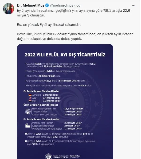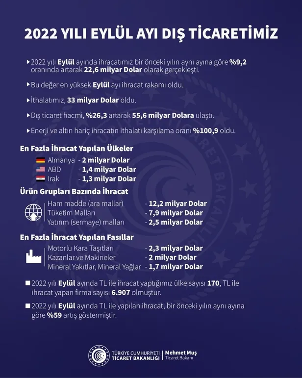 Ticaret Bakanı Mehmet Muş, Türkiye'nin eylül ayında 22,6 milyar dolarlık ihracat gerçekleştirdiğini ve bu rakamın eylül ayı bazında rekor olduğunu söyledi. Turkuvaz Medya Grubu'nun yazılı basındaki amiral gemisi Sabah Gazetesi tarafından düzenlenen Türkiye İhracat Seferberliği Zirvesi 4 Ekim 2022, Salı günü Trabzon'da Ticaret Bakanı Mehmet Muş'un katılımıyla gerçekleştirildi. Ticaret Bakanı Mehmet Muş, "Geride bıraktığımız eylül ayında ihracatımız, geçtiğimiz yılın aynı ayına göre yüzde 9,2 artışla 22,6 milyar dolar olmuştur." dedi.