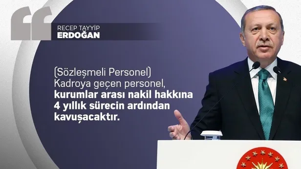 Kadroya geçen personel kurumlar arası nakil hakkına 4 yıllık sürecin ardından kavuşacaktır. Mahalli idarelerdeki sözleşmelilerden kadroya geçenler sadece mahalli idareler arasında yer değiştirebilecektir. Böylece kamu çalışanlarının önemli bir sorununu daha çözerek sözleşmeli kadrolu statüsünü daha adil ve sürdürülebilir hale getirmeyi hedefliyoruz. Bu konudaki hukuki düzenlemenin en kısa sürede Meclise sunularak hayata geçmesini sağlayacağız. Yaptığımız bu önemli kamu personel reformunun kadroya geçme hakkı elde eden 424 bin sözleşmelimize ve ailelerine hayırlı olmasını diliyorum.