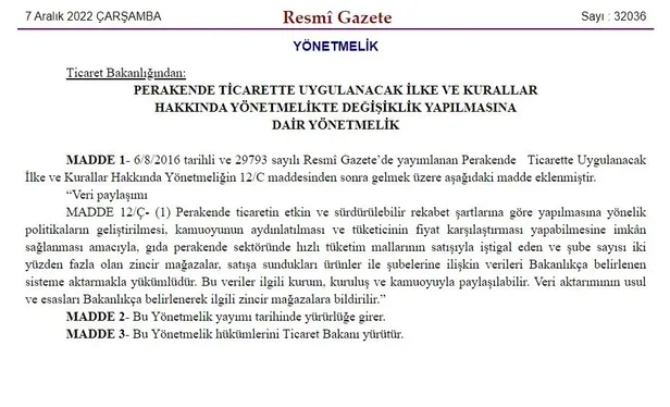 Perakende ticaretin etkin ve sürdürülebilir rekabet şartlarına göre yapılmasına yönelik politikaların geliştirilmesi, kamuoyunun aydınlatılması ve tüketicinin fiyat karşılaştırması yapabilmesine imkân sağlanması amacıyla, gıda perakende sektöründe hızlı tüketim mallarının satışıyla iştigal eden ve şube sayısı iki yüzden fazla olan zincir mağazalar, satışa sundukları ürünler ile şubelerine ilişkin verileri Bakanlıkça belirlenen sisteme aktarmakla yükümlüdür. Bu veriler ilgili kurum, kuruluş ve kamuoyuyla paylaşılabilir. Veri aktarımının usul ve esasları Bakanlıkça belirlenerek ilgili zincir mağazalara bildirilir.