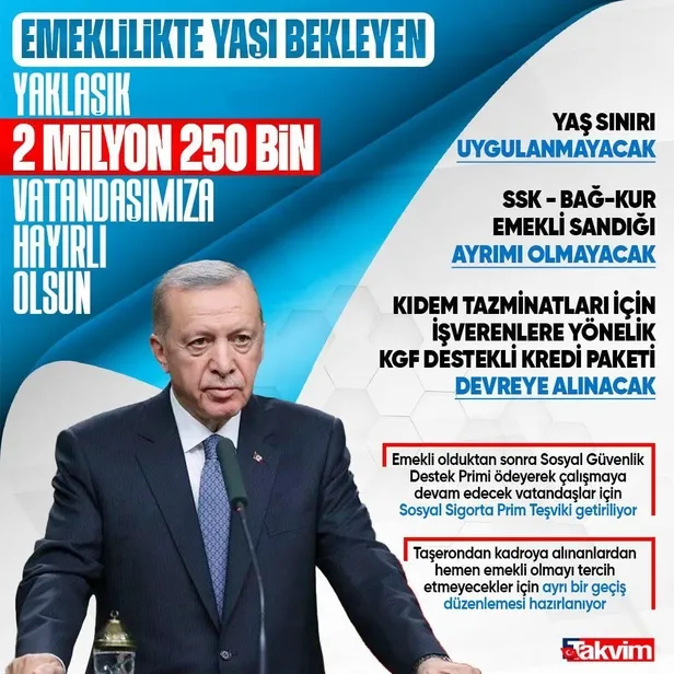 Başkan Erdoğan, "Yaş şartı olmadan emekliliğe imkan sağlayan düzenlemeyi SSK, Bağkur, Emekli Sandığı ayrımı olmaksızın mevcut yapıdaki herkes için geçerli kılıyoruz" dedi.