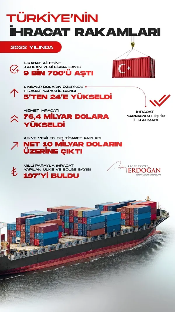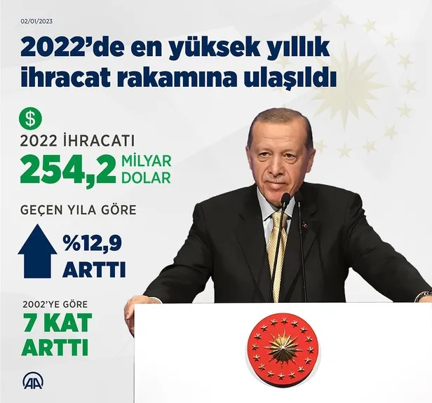 Başkan Recep Tayyip Erdoğan, "Küresel olumsuzluklara rağmen 2022 yılı ihracatımız, geçen yıla göre yüzde 12,9 oranında artışla 254,2 milyar dolar olarak gerçekleşmiştir. Bu rakam, Cumhuriyet tarihimizin rekorudur." dedi.