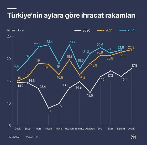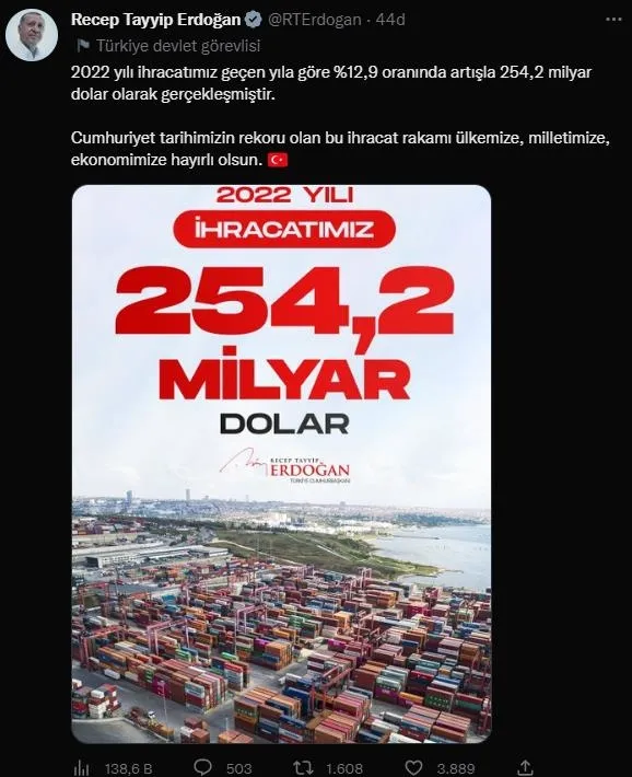 Sosyal medyadan ihracat rakamlarıyla ilgili açıklamalarda bulunan Başkan Erdoğan, "2022 yılı ihracatımız geçen yıla göre %12,9 oranında artışla 254,2 milyar dolar olarak gerçekleşmiştir. Cumhuriyet tarihimizin rekoru olan bu ihracat rakamı ülkemize, milletimize, ekonomimize hayırlı olsun" dedi.