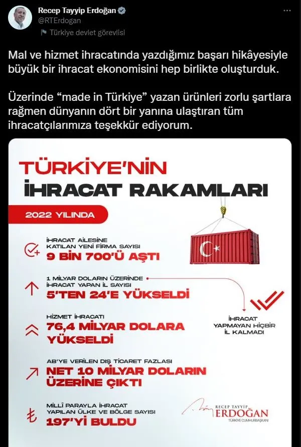 İhracat ailesine katılan yeni firma sayısını da paylaşan Erdoğan, "Mal ve hizmet ihracatında yazdığımız başarı hikâyesiyle büyük bir ihracat ekonomisini hep birlikte oluşturduk. Üzerinde "made in Türkiye" yazan ürünleri zorlu şartlara rağmen dünyanın dört bir yanına ulaştıran tüm ihracatçılarımıza teşekkür ediyorum." ifadelerini kullandı.