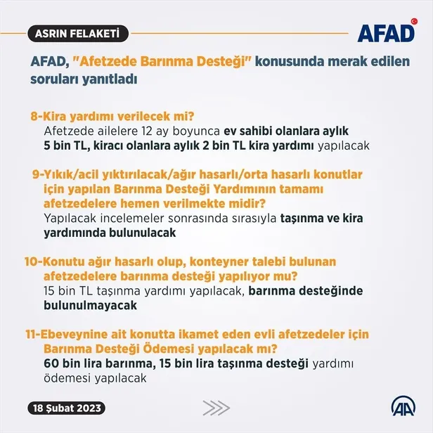 Konutu yıkık, acil yıktırılacak, ağır hasarlı ve orta hasarlı olarak tespit edilen afetzede ailelere 15 bin lira taşınma yardımı yapılacak. Afetzede ailelere 12 ay süreyle, ev sahibi olanlara aylık 5 bin lira olmak üzere 60 bin lira, kiracı olanlara ise aylık 2 bin lira olmak üzere 24 bin lira kira yardımı yapılacak. İşte desteklerle ilgili tüm merak edilen detaylar…