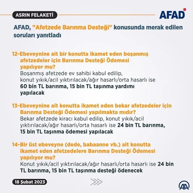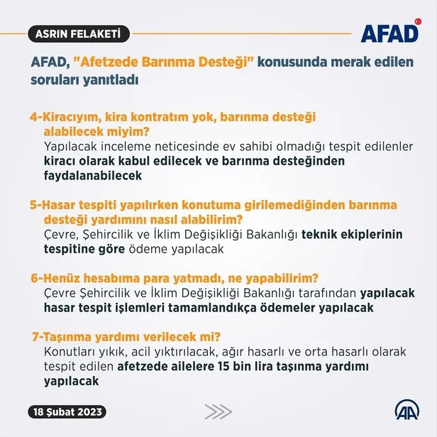 Hasar gören konutta oturduğu tespit edilen afetzedelere barınma desteği yapılacak. Kimlik paylaşım sistemindeki kayıtların uyuşmaması halinde afetzedenin ikametgahı teyit edildikten sonra ödemeler gerçekleştirilecek.