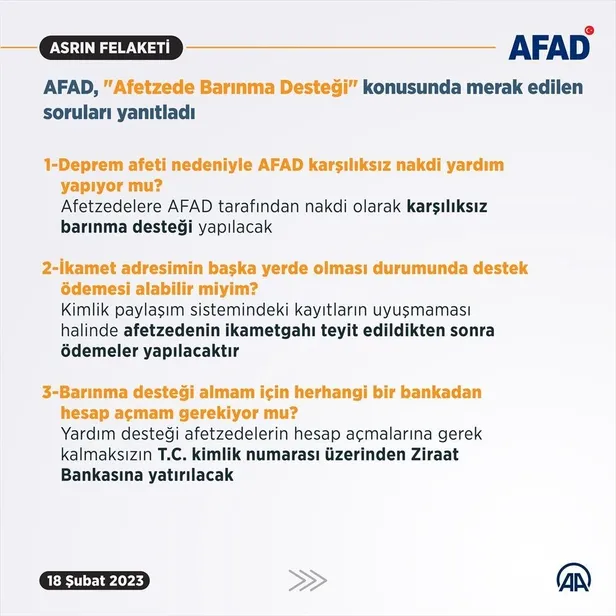 Afetzedeler, hesap açmalarına gerek kalmaksızın her ilde bulunan Ziraat Bankası şubelerinden barınma desteğini alabilecek. Yardım desteği, Ziraat Bankası'nda hesabı bulunanların kendi hesabına, hesabı olmayanların ise TC kimlik numaralarına yatırılacak.