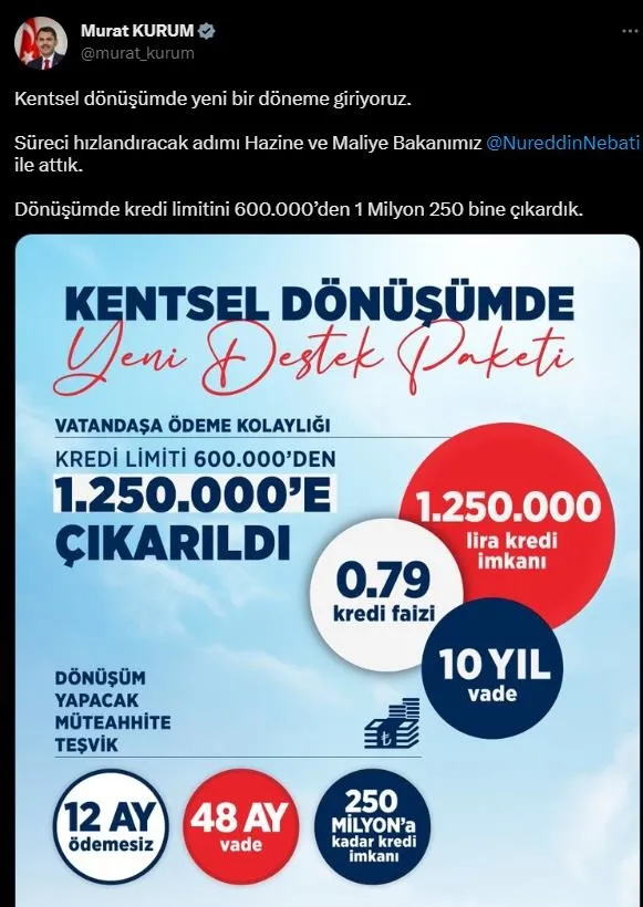Bakan Kurum da Twitter hesabından yaptığı açıklamada, kentsel dönüşümde yeni bir döneme girildiğini belirterek, süreci hızlandıracak adımı attıklarını, dönüşümde kredi limitini 600 bin liradan 1 milyon 250 bin liraya çıkardıklarını bildirdi.