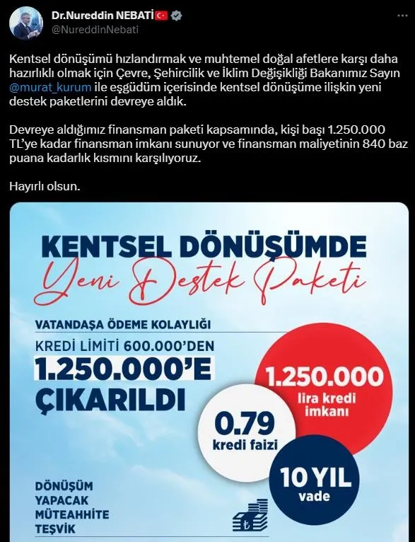 Hazine ve Maliye Bakanı Nureddin Nebati, Twitter hesabından yaptığı açıklamada, kentsel dönüşümü hızlandırmak ve muhtemel doğal afetlere karşı daha hazırlıklı olmak için Çevre, Şehircilik ve İklim Değişikliği Bakanı Murat Kurum ile eş güdüm içinde kentsel dönüşüme ilişkin yeni destek paketlerini devreye aldıklarını bildirdi.