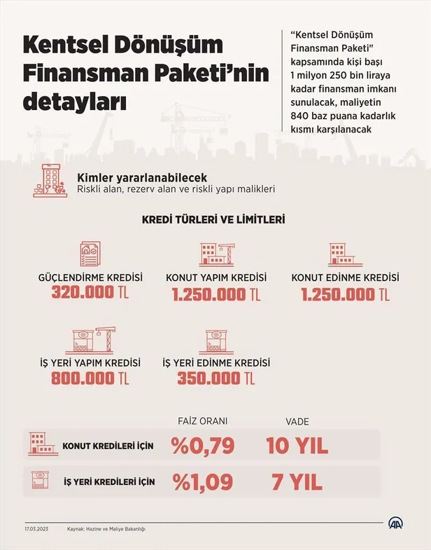 Hazine ve Maliye Bakanlığı ile Çevre, Şehircilik ve İklim Değişikliği Bakanlığınca hazırlanan Kentsel Dönüşüm Finansman Paketi kapsamında, malikler ile yüklenici ve konut üreticilerine yönelik devlet destekli kredilerin detayları belli oldu.