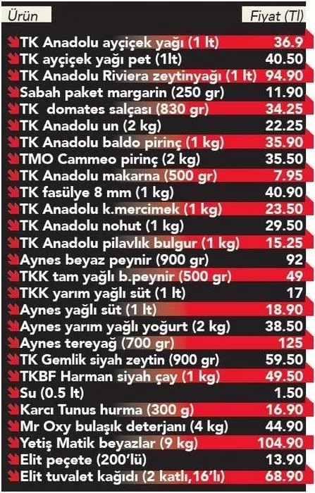 İthal pilavlık princin iki buçuk kilogramı 47.50 kuruştan, 41 liraya, 750 gram organik yoğurdun kilosu yüzde 25 indirimle 29.90'a, 650 gram domates salçası yüzde 20'lik indirimle 36 lira 95 kuruşa, 450 gram gevrek yüzde 19 indirimle 44.55 kuruştan, 35.90 kuruşa, beş kilogram unun fiyatı ise yüzde 6.6'lık indirimle 53.50 kuruştan 49.95'e düşürüldü.