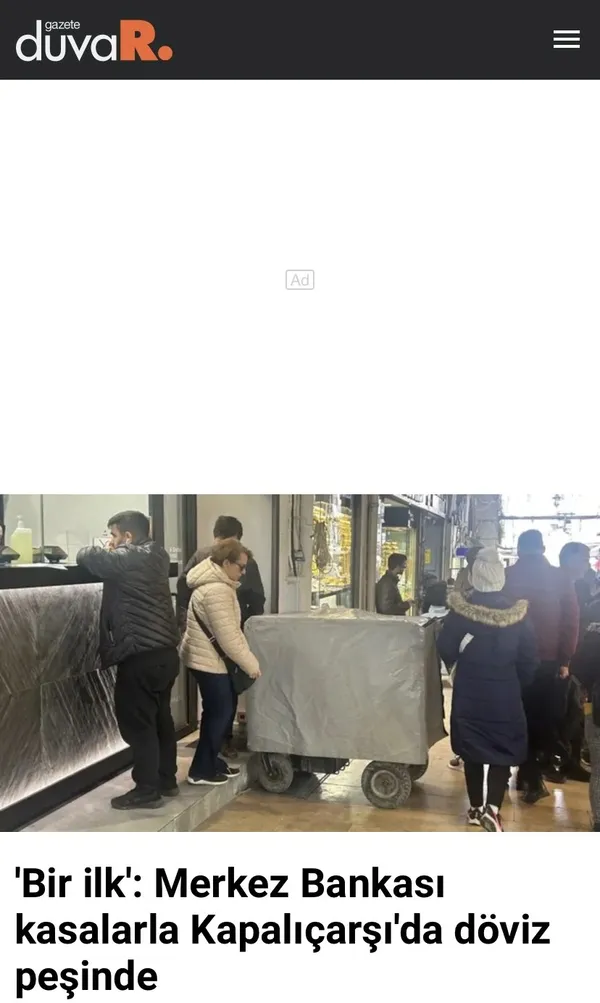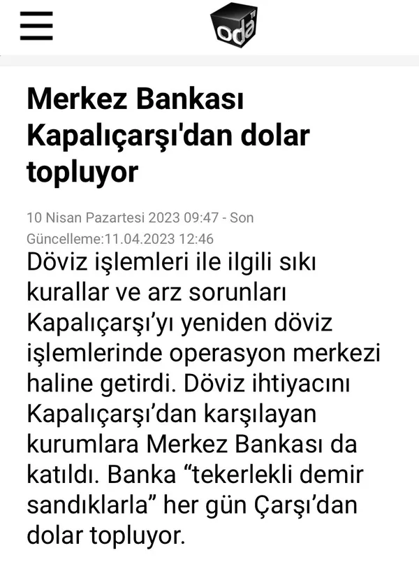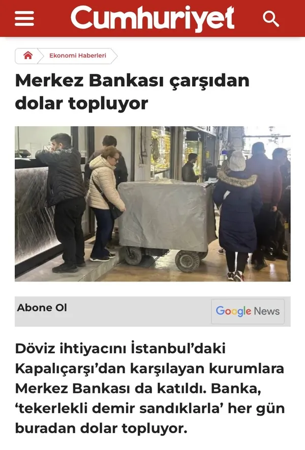 Haberde "Döviz ihtiyacını Kapalıçarşı'dan karşılayan kurumlara Merkez Bankası da katıldı. Banka "tekerlekli demir sandıklarla" her gün Çarşı'dan dolar topluyor." ifadelerine yer verildi.