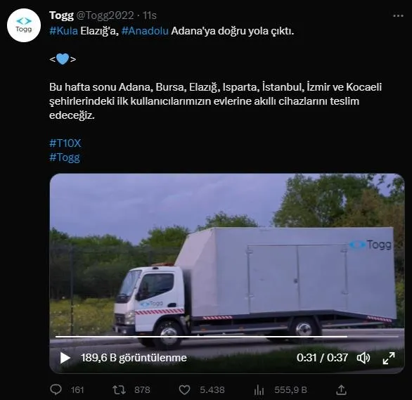 Togg'un ilk akıllı cihaz modeli T10X, 7 ilde sipariş hakkı kazanan kullanıcılara teslim edilmek üzere yola çıktı. Paylaşımda, akıllı cihazların ilk kullanıcılar için evlerine teslim edileceğinin bildirilmesi dikkati çekti.