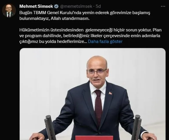 Yemin töreninin ardından sosyal medyadan bir paylaşım yapan Hazine ve Maliye Bakanı Mehmet Şimşek, piyasalara güven mesajı verdi.