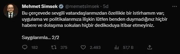 Bakan Şimşek, Twitter hesabından, vatandaşlara seslendi.