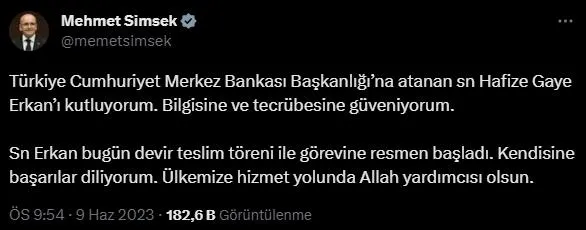 Hazine ve Maliye Bakanı Mehmet Şimşek, Türkiye Cumhuriyet Merkez Bankası (TCMB) Başkanlığına atanan Hafize Gaye Erkan'ı kutlayarak, "Bilgisine ve tecrübesine güveniyorum." ifadelerini kullandı.