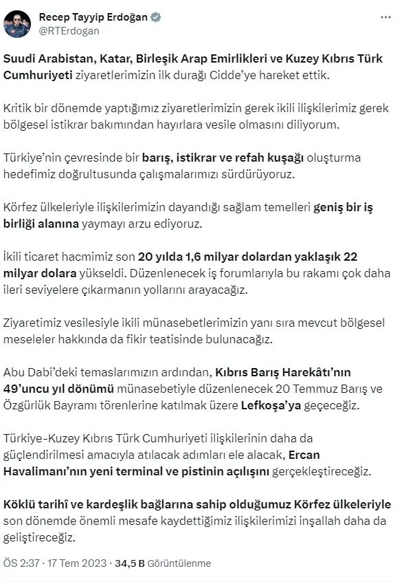 "Suudi Arabistan, Katar, Birleşik Arap Emirlikleri ve Kuzey Kıbrıs Türk Cumhuriyeti ziyaretlerimizin ilk durağı Cidde'ye hareket ettik. Kritik bir dönemde yaptığımız ziyaretlerimizin gerek ikili ilişkilerimiz gerek bölgesel istikrar bakımından hayırlara vesile olmasını diliyorum. Türkiye'nin çevresinde bir barış, istikrar ve refah kuşağı oluşturma hedefimiz doğrultusunda çalışmalarımızı sürdürüyoruz. Körfez ülkeleriyle ilişkilerimizin dayandığı sağlam temelleri geniş bir iş birliği alanına yaymayı arzu ediyoruz. İkili ticaret hacmimiz son 20 yılda 1,6 milyar dolardan yaklaşık 22 milyar dolara yükseldi. Düzenlenecek iş forumlarıyla bu rakamı çok daha ileri seviyelere çıkarmanın yollarını arayacağız. Ziyaretimiz vesilesiyle ikili münasebetlerimizin yanı sıra mevcut bölgesel meseleler hakkında da fikir teatisinde bulunacağız. Abu Dabi'deki temaslarımızın ardından, Kıbrıs Barış Harekâtı'nın 49'uncu yıl dönümü münasebetiyle düzenlenecek 20 Temmuz Barış ve Özgürlük Bayramı törenlerine katılmak üzere Lefkoşa'ya geçeceğiz. Türkiye-Kuzey Kıbrıs Türk Cumhuriyeti ilişkilerinin daha da güçlendirilmesi amacıyla atılacak adımları ele alacak, Ercan Havalimanı'nın yeni terminal ve pistinin açılışını gerçekleştireceğiz. Köklü tarihî ve kardeşlik bağlarına sahip olduğumuz Körfez ülkeleriyle son dönemde önemli mesafe kaydettiğimiz ilişkilerimizi inşallah daha da geliştireceğiz."