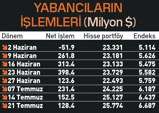 Yabancı yatırımcılar hisse senedi piyasasında alım serisini yedinci haftada da sürdürerek 14-21 Temmuz haftasında da 128.4 milyon dolarlık net alım yaptı. Böylelikle 7 haftalık dönemde net hisse alım miktarı toplam 1 milyar 610 milyon dolar oldu. Bununla birlikte 7 haftalık alım dönemi yabancıların 1 Nisan 2016 haftasından beri gerçekleştirdiği en uzun alım serisi oldu.