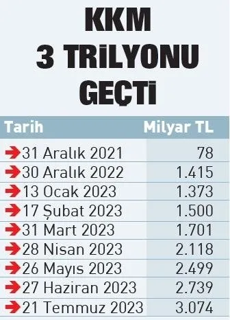 Mevduatta TL'nin payının artmasında özellikle son dönemde hızla büyüyen kur korumalı mevduat hesapları etkili oldu. Bankacılık Düzenleme ve Denetleme Kurumu'nun haftalık verilerine göre, KKM'nin 2022 sonunda 1 trilyon 415 milyar lira olan büyüklüğü 21 Temmuz 2023 itibarıyla 3 trilyon 74 milyar lira ile tarihi zirveye ulaştı.