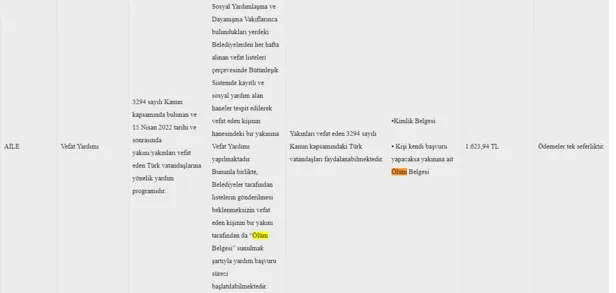 E-Vefat Yardımı, 3294 sayılı Kanun kapsamında yer alan ve 15 Nisan 2022 tarihinden itibaren yakınlarını kaybeden Türk vatandaşlarına yönelik bir yardım programıdır. Bu program, sosyal yardımlaşma ve dayanışma vakıfları tarafından yürütülmektedir. Yardım, vefat listelerine dayalı olarak Bütünleşik Sistemde kayıtlı ve sosyal yardım alan haneler arasında tespit edilmekte ve vefat eden kişinin bir yakınına yönelik olarak yapılır.