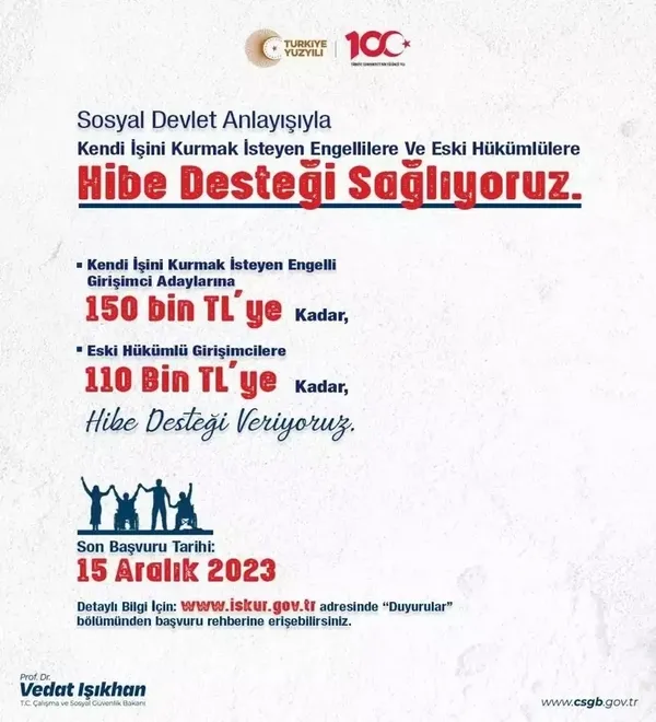 Çalışma ve Sosyal Güvenlik Bakanı Vedat Işıkhan, sosyal medya üzerinden engelli ve eski hükümlü vatandaşlara hibe desteği verileceğini duyurdu.