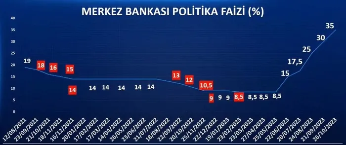 TCMB'den faiz oranlarına ilişkin yapılan duyuruda, Hafize Gaye Erkan başkanlığında toplanan Kurul'un politika faizinin yüzde 35'e çıkarılmasına karar verdiği bildirildi.