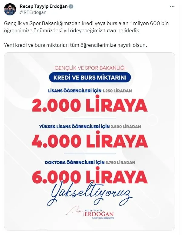 📌2024'te Lisans öğrencileri için 1.250 liradan 2 bin liraya