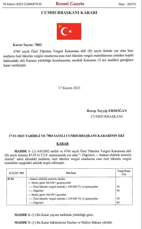 Kararla, motor gücü 160 kW'ın altındaki sadece elektrik motorlu olan binek otomobiller için ÖTV oranına esas ÖTV matrahında değişikliğe gidildi.