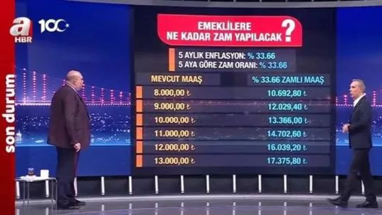 5 aylık enflasyon yüzde 33.66 oldu. Şu anda Türkiye'nin 15,5 milyona yaklaşan emekli sayısı var. Bunun 3 milyon kadarı kamu emeklisi geriye kalanı SSK ve Bağ-Kur emeklisi Şu anda ortaya çıkan 5 aylık enflasyona göre alacakları zam oranı yüzde 33.66'dır.