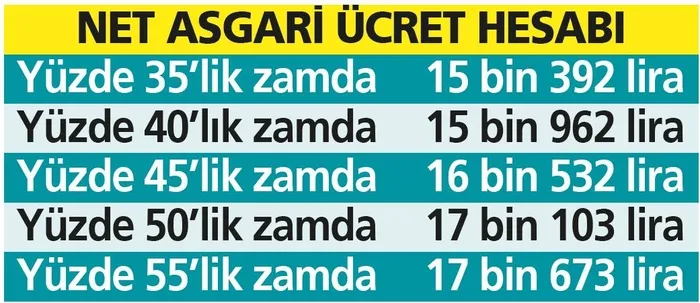 Memur ve memur emeklilerine verilecek yüzde 50 artışın da asgari ücret için referans olması bekleniyor. Yıllık ücret için artışın yüzde 55'lere kadar çıkması ve net asgari ücretin 17 bin liranın üzerinde belirlenmesi de gündemde.