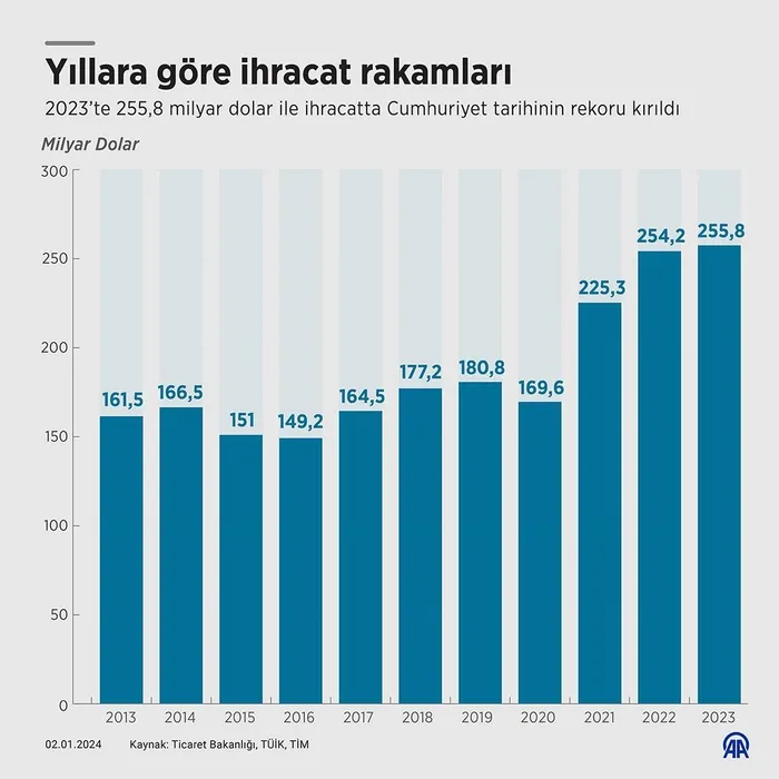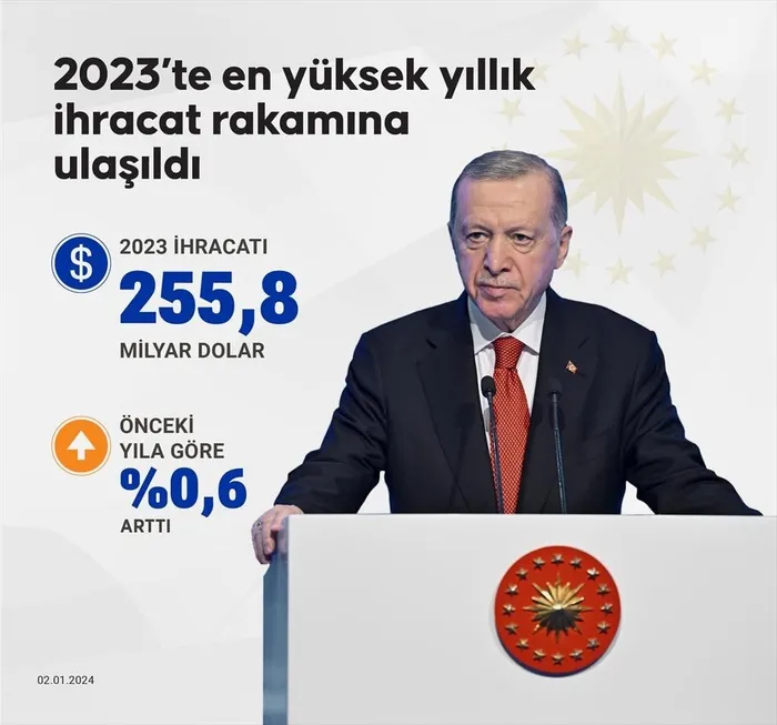 "2023 yılı ihracatımız geçen yıla göre yüzde 0,6 oranında artışla 255 milyar 809 milyon dolara ulaşarak, Cumhuriyet tarihimizin rekorunu kırmıştır. Bu rakamla Orta Vadeli Program'daki 255 milyar dolarlık ihracat hedefimizi de aştık. 2023 yılı aralık ayında ihracatımız yüzde 0,44 artışla 23 milyar dolar oldu. 2023 senesinde ihracatın ithalatı karşılama oranı 0,8 puan artışla yüzde 70,7'ye yükseldi. Bakınız bu oran, biz göreve geldiğimizde sadece yüzde 50 civarındaydı. Ülkemizin dış ticaret açığı geçen yıla göre yüzde 3,2 oranında geriledi. Temmuz, ağustos, ekim, kasım ve aralık aylarında en yüksek ihracat rakamına ulaştık. Temmuz hariç yılın son 7 ayında dış ticaret açığımız bir önceki yılın aynı ayına göre azaldı.