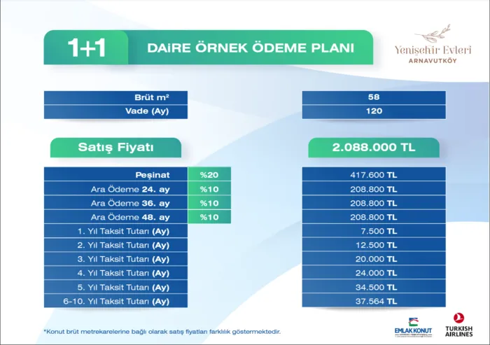 - 1+1 Daireler: 58 metrekare, 2.088.000 TL. Yüzde 20 peşinat sonrası, 24., 36. ve 48. aylarda ara ödemeler yapılacak.