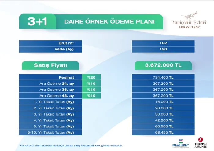 - 3+1 Daireler: 102 metrekare, 3.672.000 TL. Bu daire tipi için de benzer ödeme planları mevcut.