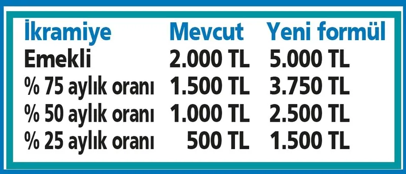 Burada halen 2 bin lira olan bayram ödemesinin tutarının, Cumhuriyet'in 100'üncü yıl dönümü nedeniyle tüm emeklilere verilen ikramiyeyle eşitlenmesi formülü gündeme geldi. 5 bin liralık bu ikramiye tutarının, Ramazan ve Kurban Bayramları için de geçerli olabileceği belirtiliyor. Yüzde 150'lik artış anlamına gelen bu formül hayata geçerse, emekliler Ramazan Bayramı öncesinde 5 bin, Kurban Bayramı öncesinde 5 bin lira olmak üzere bu yıl 10 bin lira alabilecek.