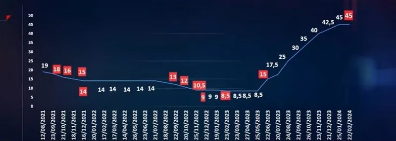 TCMB, 25 Ocak'ta gerçekleştirilen 2024 yılının ilk toplantısında politika faizini 250 baz puan artırarak yüzde 45'e çıkarmıştı.