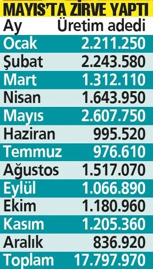 En yüksek üretim 2 milyon 607 bin adet ile Mayıs'ta görülürken, onu 2 milyon 243 bin adet ile Şubat ayı takip etti.