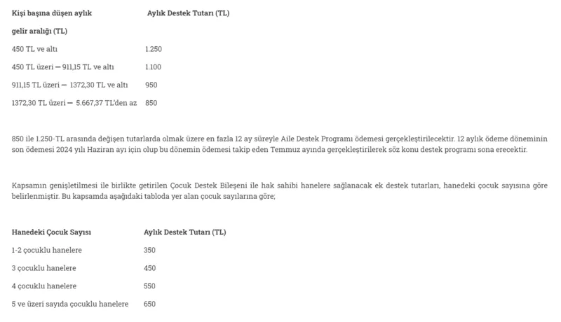Aile Destek Programı, ekonomik sıkıntı içinde olan vatandaşlara yönelik olarak tasarlanmış bir yardım paketidir. Bu programın temel amacı, ihtiyaç sahibi ailelerin asgari geçim koşullarını iyileştirmek ve onlara ekonomik açıdan destek olmaktır. Program kapsamında, haneye giren toplam gelir dikkate alınarak, yardıma ihtiyaç duyan ailelere maddi destek sağlanır.