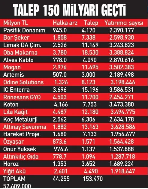 20 şirketin halka arz büyüklüğü 44 milyar 255 milyon liraya ulaşırken, gelen talebin büyüklüğü ise 153.5 milyar lira oldu. 20 hisse senedinde toplam 52.6 milyon kişiye hisse satışı gerçekleştirdi.