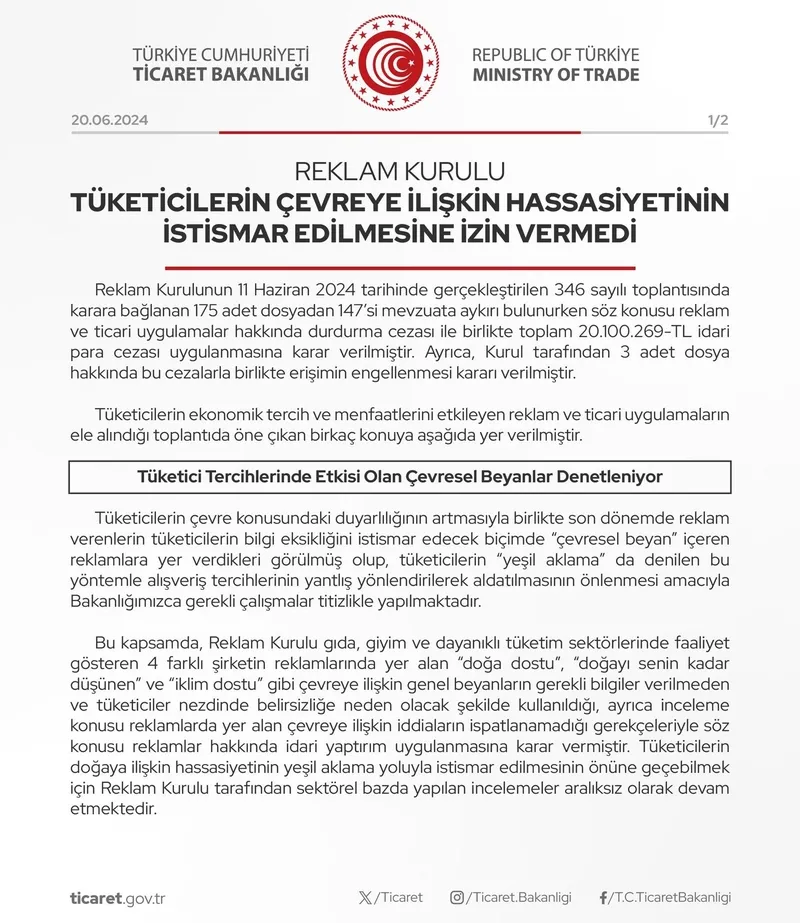 Bu kapsamda, Kurul, gıda, giyim ve dayanıklı tüketim sektörlerinde faaliyet gösteren 4 şirketin reklamlarında yer alan "doğa dostu", "doğayı senin kadar düşünen" ve "iklim dostu" gibi çevreye ilişkin genel beyanların, gerekli bilgiler verilmeden ve tüketiciler nezdinde belirsizliğe neden olacak şekilde kullanıldığı, ayrıca inceleme konusu reklamlarda yer alan çevreye ilişkin iddiaların ispatlanamadığı gerekçeleriyle bu şirketlere idari yaptırım uygulanmasına karar verdi.