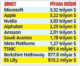 Yılın ilk yarısında küresel pay piyasaları rekor kırarken, dünyanın piyasa değeri en yüksek 10 şirketinden 9'u da bu dönemde yatırımcısına kazandırdı. Dünyanın en değerli şirketi konumu birkaç kez el değiştirse de Haziran sonu itibarıyla 3.3 trilyon dolar ile Microsoft zirvede yer aldı.
