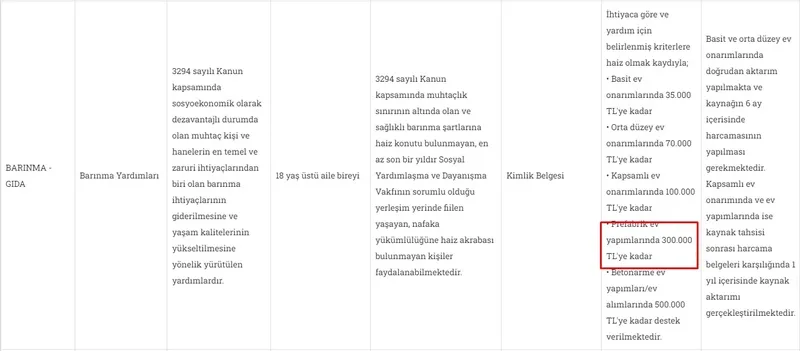 Bu şartları taşıyan bireyler, prefabrik ev yardımı için başvuruda bulunabilirler. Başvurular, Sosyal Yardımlaşma ve Dayanışma Vakıfları aracılığıyla yapılacaktır. Başvurunun kabul edilmesi durumunda, 300 bin TL'ye varan hibe para yardımı sağlanacak. Bu yardım tamamen geri ödemesiz olarak verilecek ve devlet tarafından karşılanacak.