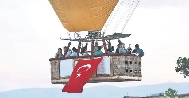 Kapadokya'da sıcak hava balonları, 15 Temmuz Demokrasi ve Milli Birlik Günü dolayısıyla Türk bayrakları ve posterlerle uçuş gerçekleştirdi. UNESCO Dünya Mirasları Listesi'ndeki Kapadokya'da, turistlerin bölgenin doğal güzelliklerini gökyüzünden izlemelerine olanak sunan sıcak hava balonları gün doğumu vaktinde uçuş için hazırlandı. Nevşehir'in Göreme beldesi ile Çavuşin köyü çevresindeki kalkış alanındaki balonların sepetlerine görevlilerce Türk bayrakları ve posterler asıldı. Bölgedeki bir firma tarafından tasarlanıp üretilen kalp figürlü sıcak hava balonunun sepetine ise üzerinde şehit Astsubay Ömer Halisdemir'in fotoğrafı ile "unutmadık, unutturmayacağız" yazılı pankart yerleştirildi. Peribacaları ve doğal kaya oluşumlarıyla kaplı vadiler üzerinde süzülen balonlar yaklaşık 1 saat boyunca bölge semalarında uçtu.