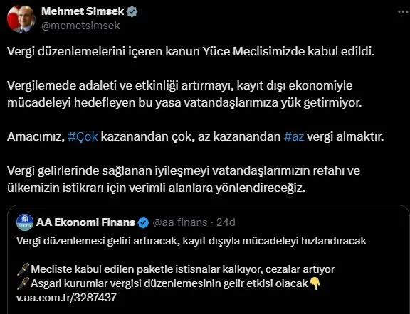 Konuyla ilgili Hazine ve Maliye Bakanı Mehmet Şimşek, sosyal medya hesabından paylaşım yaptı. Şimşek, yaptığı açıklamada, "Vergi düzenlemelerini içeren kanun Yüce Meclisimizde kabul edildi. Vergilemede adaleti ve etkinliği artırmayı, kayıt dışı ekonomiyle mücadeleyi hedefleyen bu yasa vatandaşlarımıza yük getirmiyor. Amacımız, çok kazanandan çok, az kazanandan az vergi almaktır. Vergi gelirlerinde sağlanan iyileşmeyi vatandaşlarımızın refahı ve ülkemizin istikrarı için verimli alanlara yönlendireceğiz." dedi.